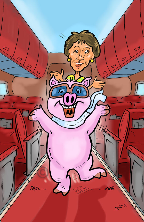 Sir Pigglesworth Action & Adventure Chapter Books for Children ages 5-8 Look at that happy smile on Sir Pigglesworth’s face…and on JoAnn, too! They have their choice of any seat in the empty First Class section…wouldn’t you love that! Sir…